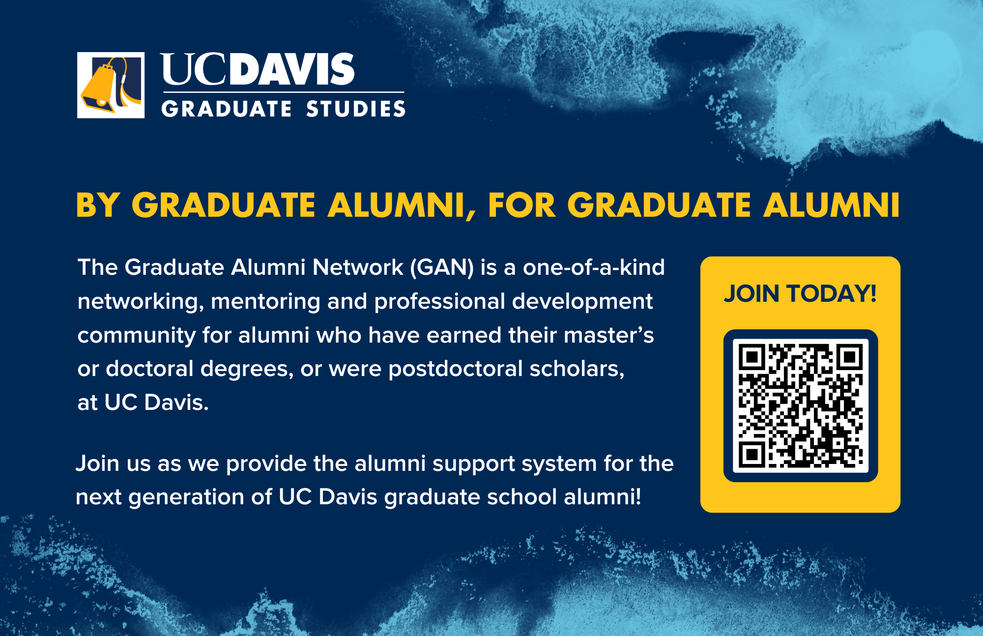 The Graduate Alumni Network (GAN) is a one-of-a-kind networking, mentoring and professional development community for alumni who have earned their master’s or doctoral degrees, or were postdoctoral scholars, at UC Davis. I was tasked with designing two-sided, eye-catching recruitment postcards that follow the UC Davis brand guidelines and Graduate Studies mission.
