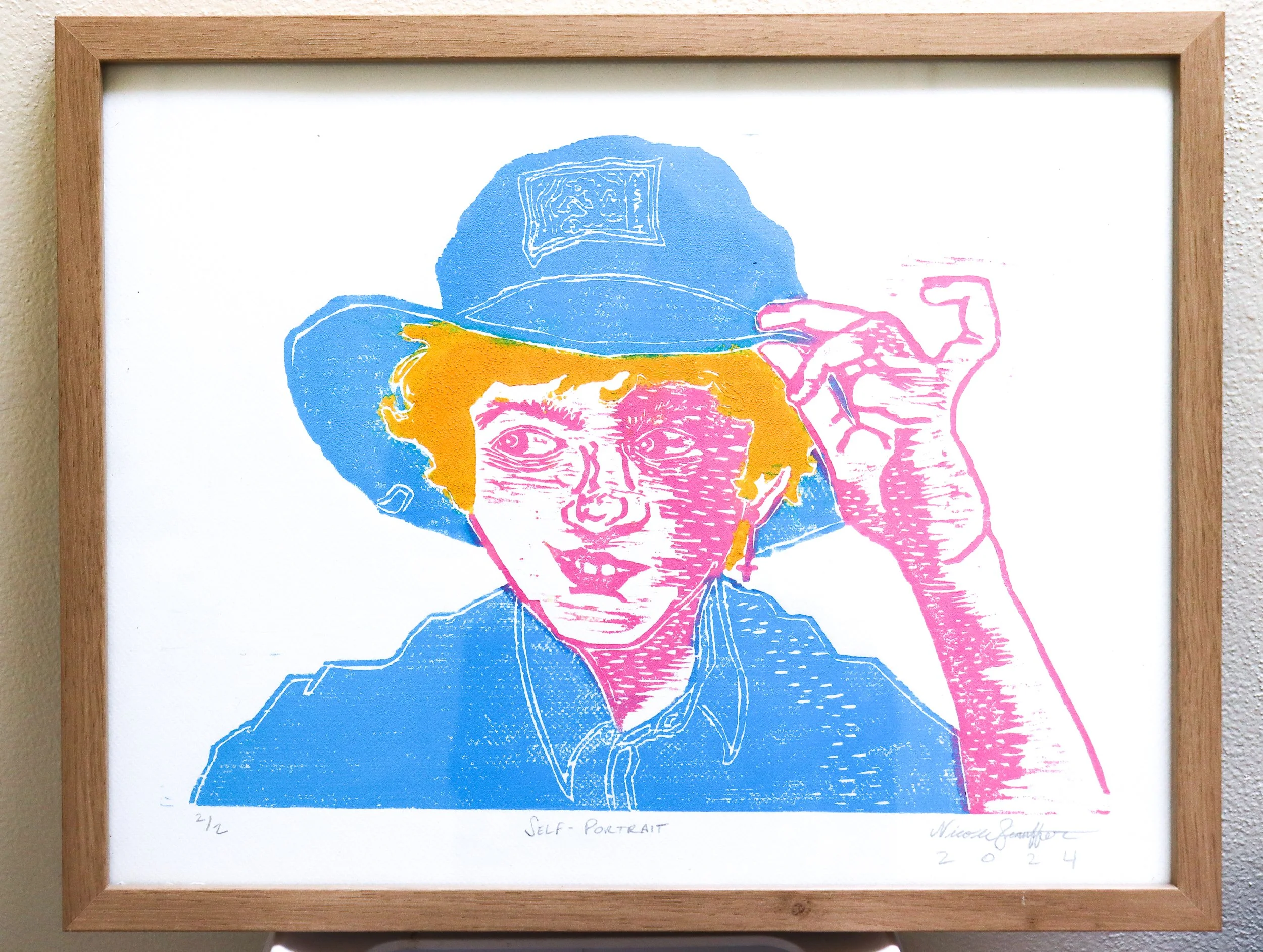 Hand-carved woodblock on basswood. Hand-mixed color meticulously rolled onto one block. Was renamed “Misfit” in later prints.